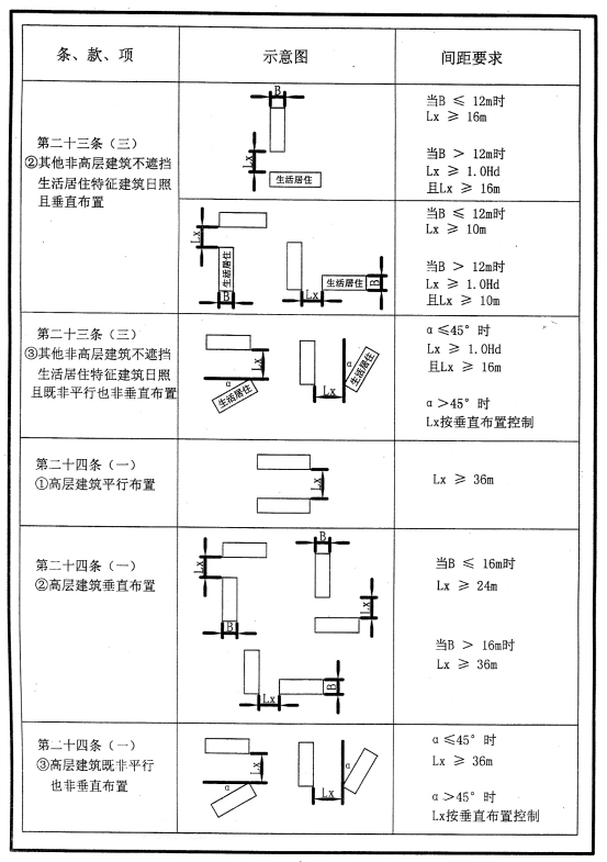 (一)高层建筑之间平行布置时,正面间距不小于36米。垂直布置时,建筑山墙宽度小于或等于16米的,正面间距不小于24米;大于16米的,按平行布置控制。既非平行也非垂直布置时,两幢建筑的夹角小于或等于45度的,最小正面间距按平行布置控制;大于45度的,按垂直布置控制。