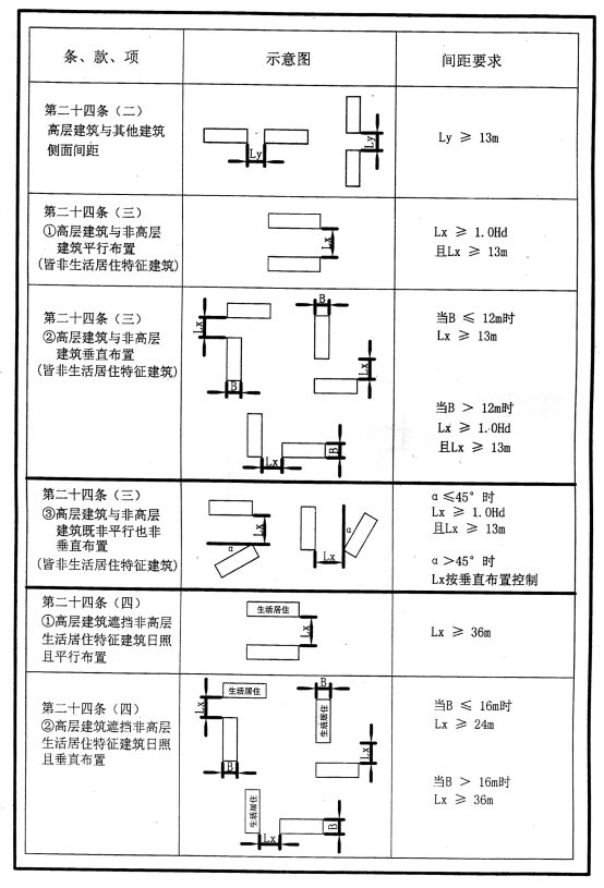 第二十四条 高层建筑间距,应综合考虑消防、景观等要求,并符合下列规定(当遮挡生活居住特征建筑日照时,应同时符合日照分析软件测算要求):