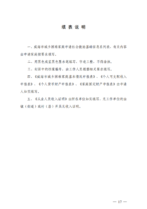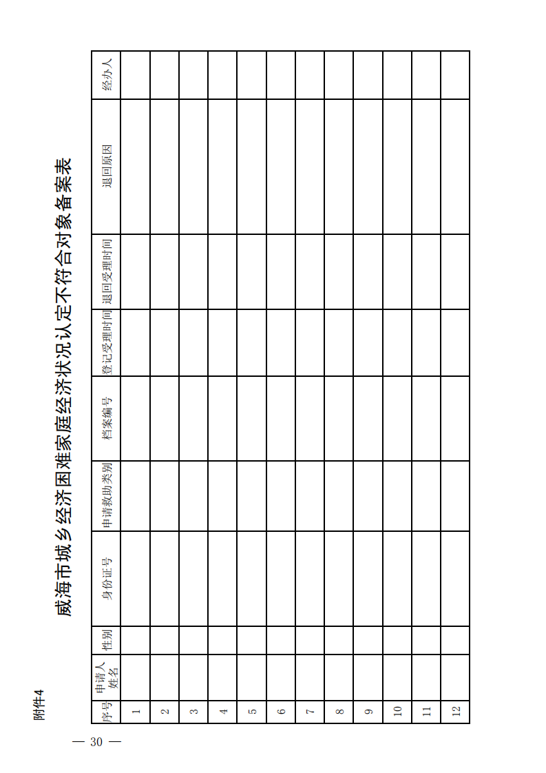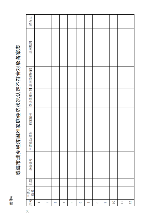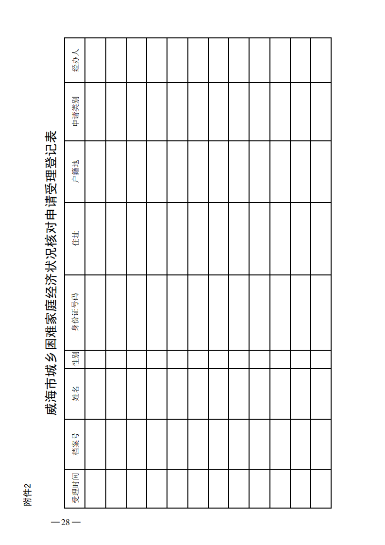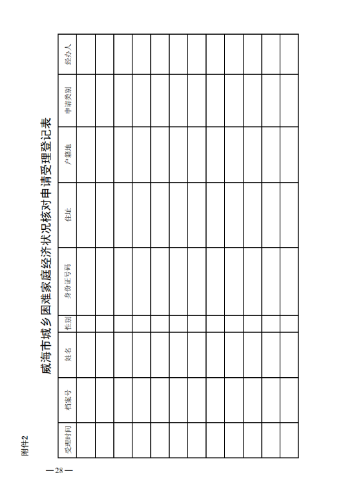 2、填表登记。镇(街道)应通过口头问询、材料审核的方式,对申请人申请材料的真实性、完整性进行初步审查,符合条件的,收齐有关申请材料,指导申请人填写《威海市城乡困难家庭基础信息表》(附件1),同时,镇(街道)填写《威海市城乡困难家庭经济状况核对申请受理登记表》(附件2),视为正式受理。对不符合申请条件的,填写《威海市城乡困难家庭经济状况不予核对通知书》(附件3),说明理由,书面退回申请人,并在《威海市城乡困难家庭经济状况认定不符合对象备条表》(附件4)上登记备案。对材料不齐全的,限期补齐,没有补齐的,视同放弃。