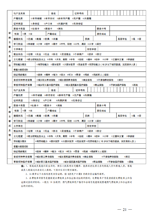 第三条 凡申请最低生活保障、医疗救助、教育救助、住房救助、临时救助等社会救助的居民家庭(以下简称城乡困难家庭),须如实申报其家庭成员的收人和财产情况,授权并配合接受村(居)和镇(街道)、区市(开发区)、市居民家庭经济状况核对机构对其家庭成员的经济状况进行核查。