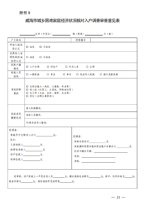 (四)入户调查。经家庭经济状况信息核对,符合条件的,镇(街道)应组织工作人员通过邻里访问、信函索证、支出推算等方式,对申请人的家庭经济状况作全面、深入、客观的了解,详细掌握申请家庭成员的基本信息,家庭收入、财产情况和其他信息后,如实填写《威海市城乡困难家庭经济状况核对入户调查审查意见表》(附件9),调查人签名并加盖公章。