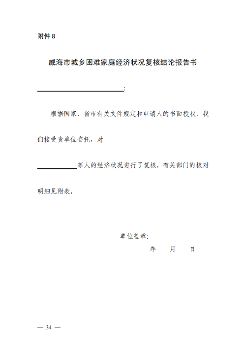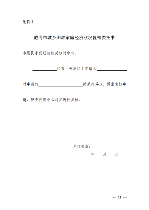 3、复审核对。申请人对核对结论有异议,可在2个工作日内向所在区市(开发区)核对中心提出复核申请(已经市核对中心核对的作为最终结论,无须复核),由所在区市(开发区)出具《威海市城乡困难家庭经济状况复核委托书》(附件7),将相关材料、信息数据报市核对中心,市核对中心在5个工作日内完成复核工作出具《威海市城乡困难家庭经济状况复核结论报告书》(附件8)反馈所在区市(开发区)核对中心,作为最终核对结论。