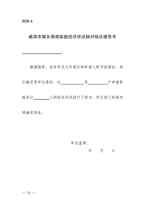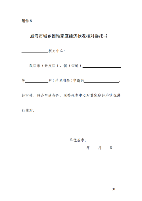 3、申请核对。对符合申请条件的,镇(街道)出具《威海市城乡困难家庭经济状况核对委托书》(附件5),将需进行经济状况核对的申请人相关信息录入威海市社会救助服务管理信息系统,连同申请人有关材料报送所在区市(开发区)核对中心进行查询核对。