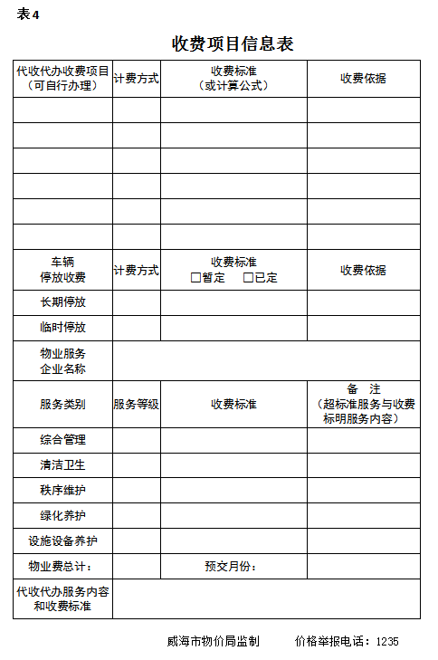 3、物业服务企业名称、服务等级、服务内容和收费依据、收费标准。物业服务企业提供代收代办服务的需标明服务内容和收费标准。