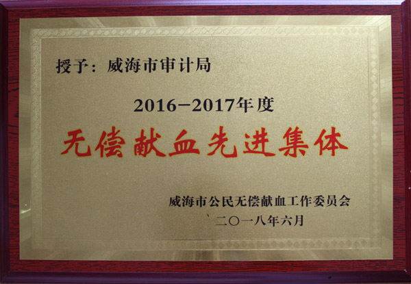 6月14日,在《中华人民共和国献血法》颁布20周年和世界献血日之际,威海市公民无偿献血工作委员会对在全市无偿献血工作中做出突出贡献的单位和个人进行隆重表彰,威海市审计局被授予全市2016-2017年度无偿献血先进单位,另有一名同志被评为全市无偿献血先进组织者。