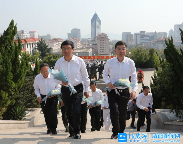 秋日的环翠区烈士陵园松柏环绕,庄严肃穆。临近10时,王鲁明、张海波等来到环翠区烈士陵园纪念广场,在烈士纪念雕塑前的平台下肃立。市委、市人大、市政府、市政协、驻威部队代表;市直有关部门单位、环翠区、国家级开发区有关部门单位人员、驻威部队官兵、烈士家属和老战士代表,社会各界群众代表,部分学校师生等共1500多人排着整齐的队列面向烈士纪念雕塑静默肃立。
