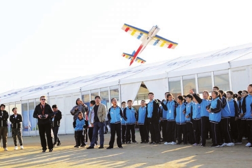 俄罗斯特技飞行表演者为孩子们展示电动航模飞行。