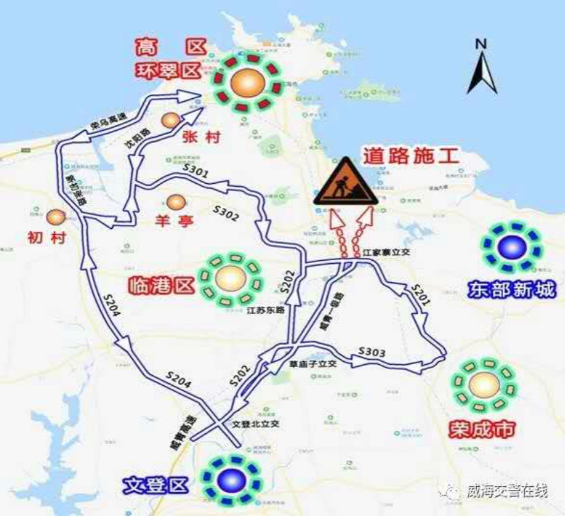 由高新区、环翠区前往临港、文登、荣成、乳山方向可以选择绕行张村、初村、羊亭;由文登、乳山前往高新区、环翠区方向可以选择绕行初村、张村,由荣成、临港前往高新区、环翠区方向可以选择绕行羊亭、张村。