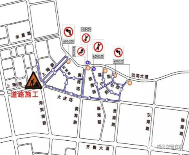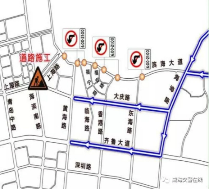 据交警部门介绍,施工期间,每天的6:00-21:00,滨海大道与香港路、福安路、福宁路、临海路的交叉口,禁止机动车由东向南左转和由南向西左转;滨海大道与上海路交叉口,禁止机动车由南向西和由西向北左转;为此,左转车辆可由海埠路绕行大庆路、齐鲁大道。