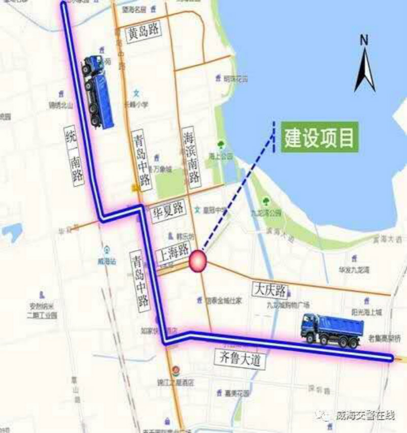 在经区与高新区之间行驶的大型货车绕行路线,可调整为齐鲁大道—青岛路—华夏路—统一南路—胶州路—塔山中路—崂山路—环山路。