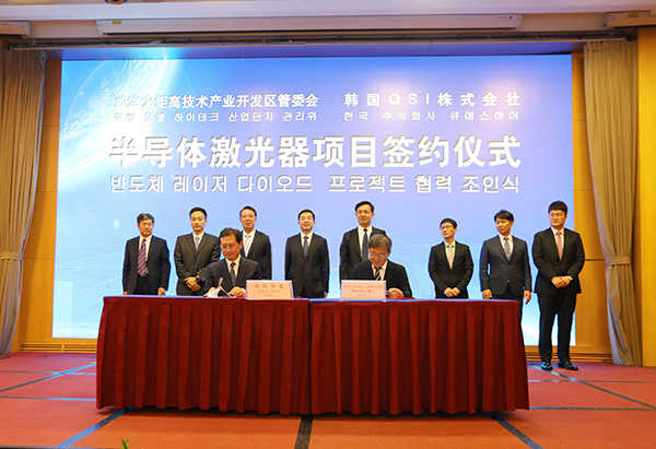 韩国株式会社QSI(奎科)是韩国上市公司,成立于2000年7月,主要从事激光扫描单元的半导体激光器研发、设计、晶圆加工、芯片制作、芯片封装、产品销售,是全球仅有的两家能够生产A3打印机用激光二极管的企业之一,其产品具有质量优、价格低、性价比高的特点,细分市场占有率稳居世界第一。此次签约的半导体激光器项目,一期投资3000万美元,填补了全球激光打印机基地此项产品和技术的空白,不仅能够为惠普提供配套生产服务,而且将进一步覆盖理光、富士施乐、利盟等多家世界知名企业。