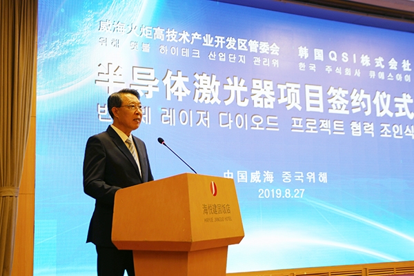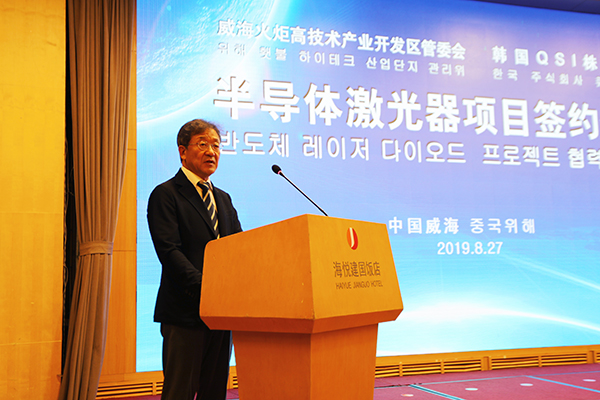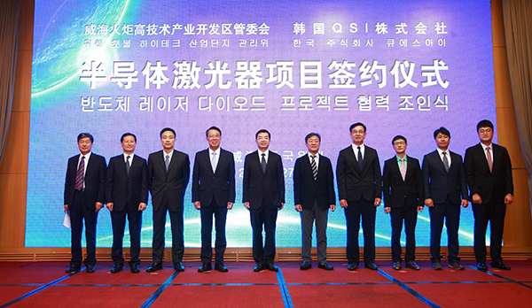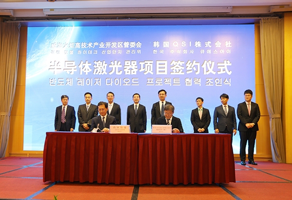 8月27日上午,全球打印机半导体激光器领军企业韩国株式会社QSI(奎科)项目正式签约入驻威海高新区。市委副书记、市长张海波,韩国株式会社QSI社长李清大,高新区党工委书记、管委会主任刘伟,QSI激光半导体有限公司总经理申哲镐等参加仪式。区领导柯学民、高明读、张强,市发改委、工信局、财政局、自然资源和规划局、生态环境局、商务局、外办、海关负责人,惠普、捷普等激光打印机产业链企业代表以及区直单位、镇街、驻区单位主要负责人共同见证了签约仪式。