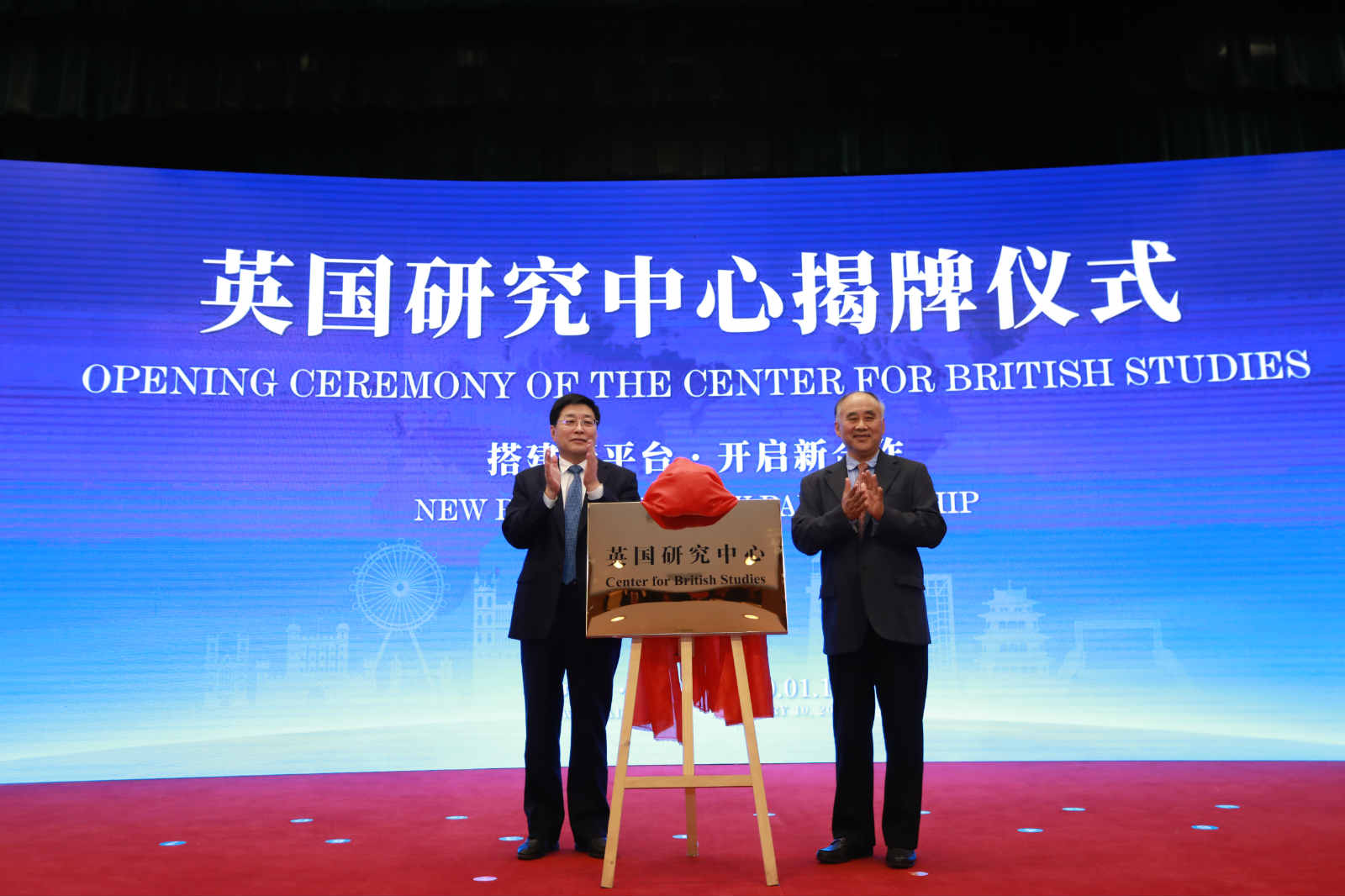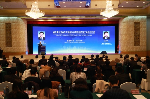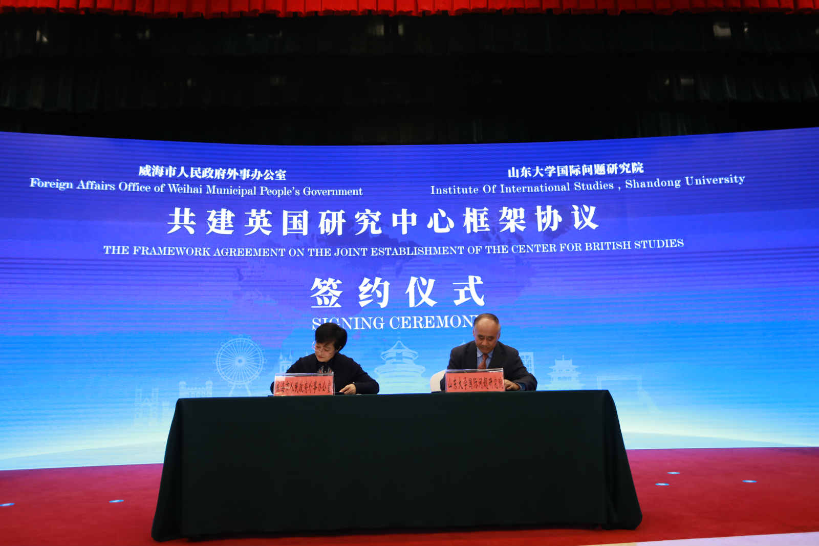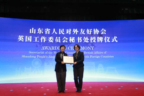 成立仪式上,宣读了前外交部长李肇星及中国人民对外友好协会发来的贺信。市政府副市长高书良与山东大学国际问题研究院院长张蕴岭共同为英国研究中心揭牌。市外办党组书记焦华与张蕴岭院长共同签署了合作共建英国研究中心框架协议。省外办党组成员、省友协常务副会长李荣为市外办授予“山东省人民对外友好协会英国工作委员会秘书处”牌子。马振岗前大使、李荣常务副会长、高书良副市长、康恩俊参赞等致辞。在威部分英资企业、对英贸易企业代表,各区市、开发区管委及有关部门、高校代表,社会组织研究人员等约120人参会。