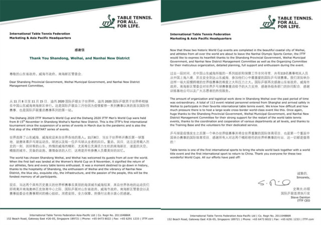 “从11月8日至11月15日,2020国际乒联女子世界杯、2020国际乒联男子世界杯相继在中国山东威海南海新区举行。这是国际乒联自3月份因为疫情暂停一系列赛事以来的首次国际性赛事,也是国际乒联重启赛事系列的第一站。”史蒂夫·丹顿在《感谢信》中写道,过去一段时间,威海所做的一系列组织和保障工作非同寻常,共有113名赛事相关人员从中国上海入境,并且安全到达南海新区,“我们深知举办这样一场大规模跨境的世界级赛事的难度之大和压力之大。国际乒联再次感谢山东省政府、威海市政府、南海新区管委会对世界乒乓球赛事重启给予的大力支持,感谢各级各部门的协同配合,感谢训练基地公司以及广大志愿者的热忱服务。”