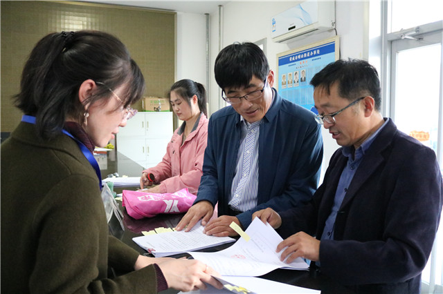 荣成市农机发展中心挂包干部杨振刚(右2)陪同修传义办理项目建设相关手续。