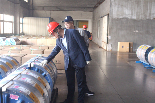 荣成市应急管理局挂包干部林宏健(前一)在企业生产线上与负责人交流。