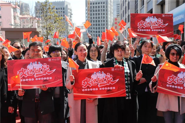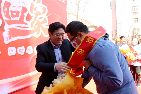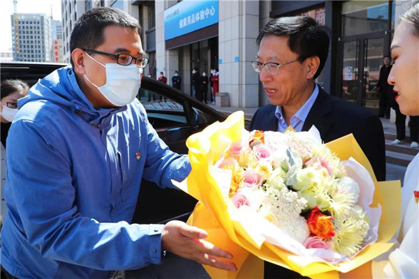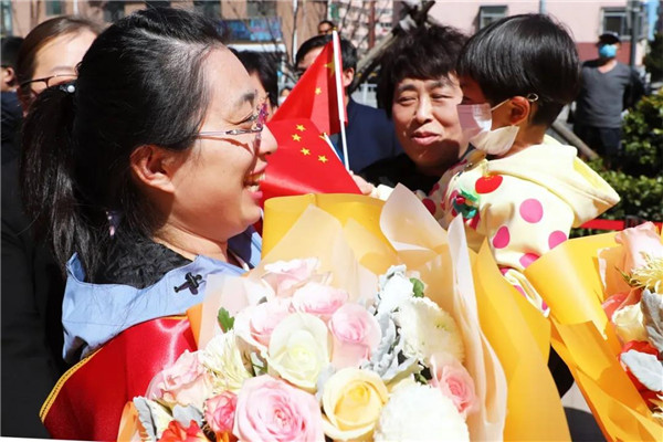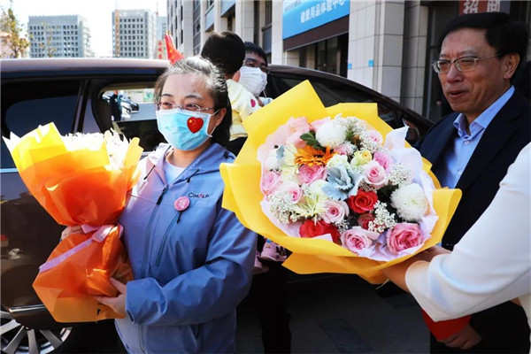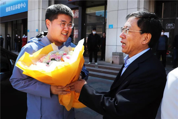 4月5日,威海市立医院四位援鄂医疗人员结束隔离返回家乡,威海市立医院院领导及同事为他们送上鲜花与绶带,向英雄们致以崇高的敬意和诚挚的感谢。