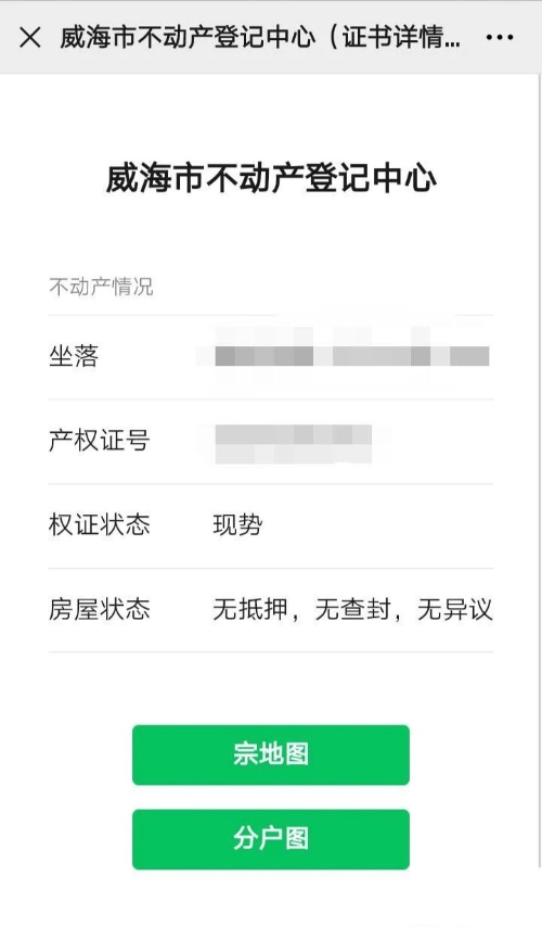 使用“爱山东”app、微信或支付宝等扫描证书左上角的二维码,即可查询到相应的不动产登记信息,点击“宗地图”和“分户图”按钮可查看对应图片。