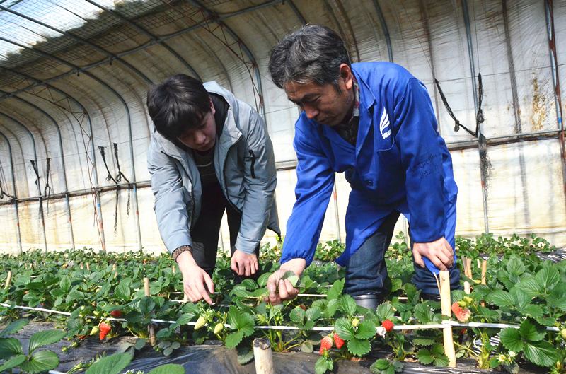 在汪疃镇硕果生态农场,农场技术员丛培波正在草莓大棚内疏花疏果、观察草莓生产情况。对于农技人员的到访,丛培波十分惊喜,热情与农技人员交流冬季大棚种植养护方法。