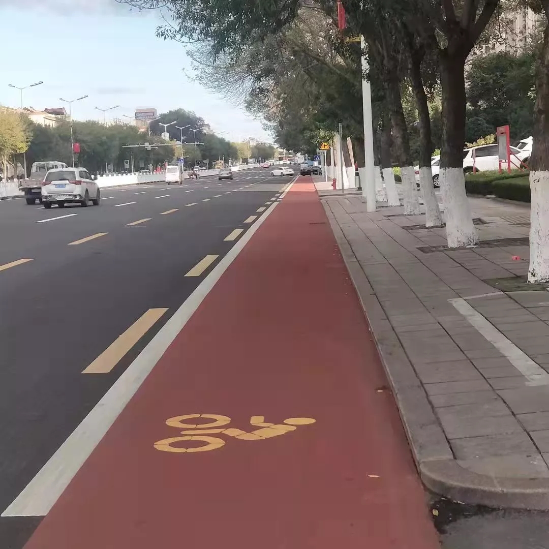 彩铺非机动车道,对道路两侧的非机动车道实施彩色铺装,通过铺撒红色防滑颗粒材料,就像给道路涂上一层“口红”,不仅能起到防滑、耐磨、降噪作用,还可以在视觉上区分黑色的机动车道和红色的非机动车道,能有效地引导交通分流,减少交通事故的发生。