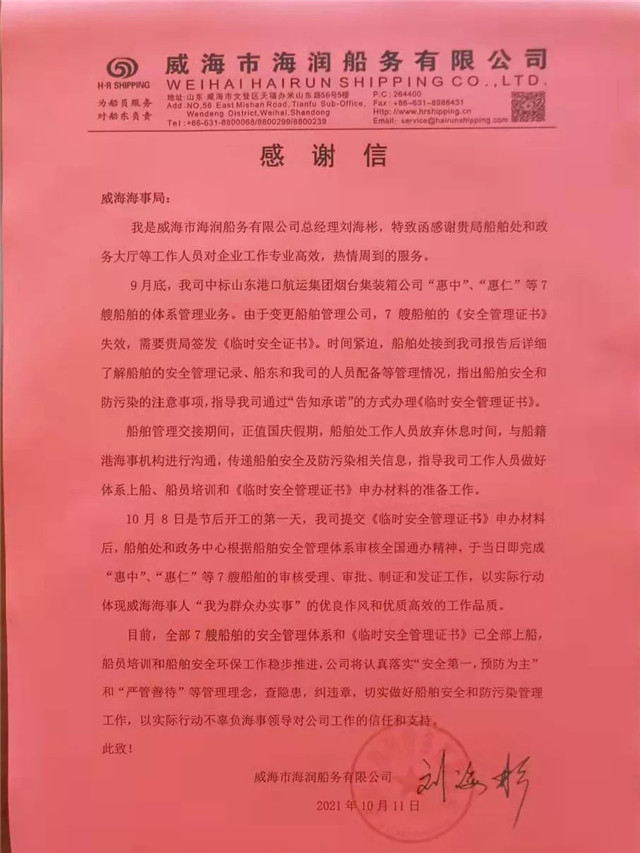 “感谢海事部门工作人员专业、热情的服务,帮助我们在一天之内完成7艘船舶受理审核发证业务,保障船舶有效运行。”10月11日一上班,威海海事局工作人员就收到一封来自威海市海润船务有限公司的感谢信,信中表达了对海事局工作人员高效服务的点赞,感谢他们将实事办进了企业的心坎上。
