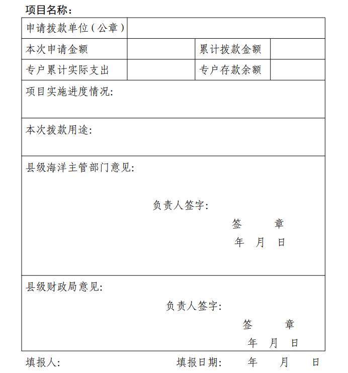 第十四条 项目申报单位根据项目实施进度申请使用专项资金,申请金额应不超过专项资金支持范围内的投资额度。申请使用专项资金时,应填写《财政专项资金银行限额支取审批表》(附件2),并提供已完成实施进度的支付流水及大额合同、发票复印件等证明材料,经区市海洋主管部门、财政部门批准后,由托管银行办理专项资金划账手续,并上报市海洋发展局、财政局备案。