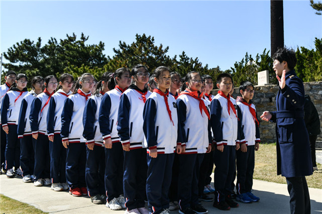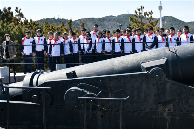 4月13日,学生在总体国家安全观刘公岛教育培训基地参观东泓炮台旧址。(来源:新华社)