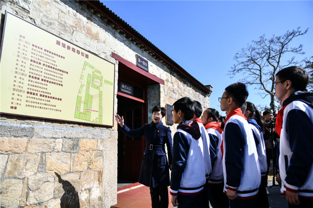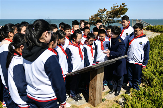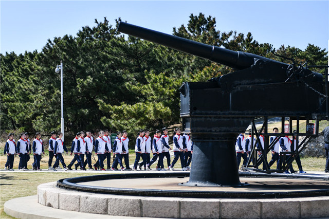 4月13日,学生在总体国家安全观刘公岛教育培训基地参观东泓炮台旧址。