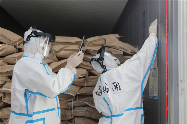 作为检验一线的操作人员,日常防护尤为重要。在货物检查技术用房,工作人员从穿防护服进入开始,到查验完成脱下防护服,旁边有安全监督员全程拍照录像监督。按照海关防护最高标准,威海港冷链运营中心实行“14+7+7”工作制度:作业14个自然日,集中隔离7日,每天进行核酸检测;居家隔离7日,返岗时进行核酸检测。真正做到“外防输入、内防反弹、人物同防”。