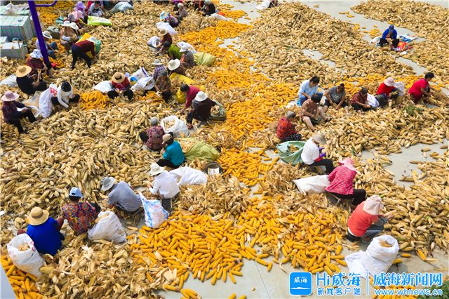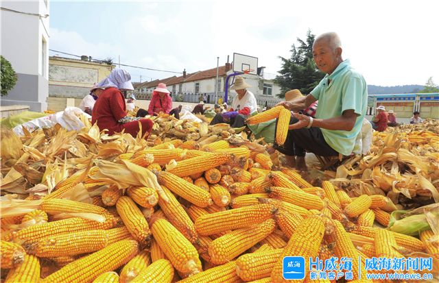 9月12日,环翠区羊亭镇王家河村的村民们正在村委办的广场上剥玉米。