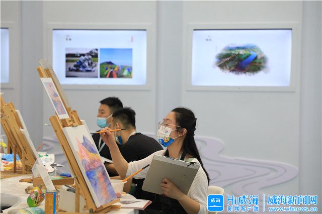 环翠区展厅打破传统的设计形式,以雕塑的语言呈现,融入了画笔、颜料等多种元素,充分体现文化艺术之城精致的气质感,分为读环翠、赏环翠、品环翠三部分。其中,读环翠部分展示的是环翠区挖掘整合城市自然资源、历史文化内涵,形成的“山、海、湖、河、院”的文旅融合发展构思。赏环翠部分重点推介中国油画小镇的风采。品环翠部分展出了锡镶、锔瓷、胶东花饽饽、大漆等非物质文化遗产。
