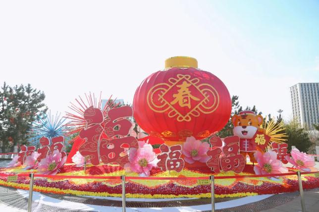今日,在临港区管委主楼前旱喷泉广场,记者看到以传统红灯笼为设计主景,搭配祥云福字、礼花灯、花朵等元素的亮化设计已经装饰完成。负责今年亮化设计的山东阆苑花卉有限公司负责人介绍,“管委主楼前旱喷泉广场的亮化设计采用传统裱糊工艺结合现代化灯光亮化技术的形式进行表达,表达‘福满临港’的美好寓意。”