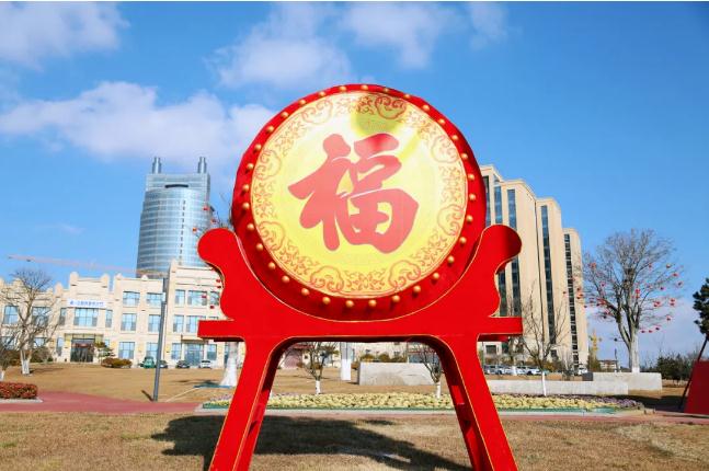 广场周边绿地,草坪自然点缀大红灯笼,灌木铺盖LED网灯,小乔木悬挂PVC红灯笼和柔性星星灯,松树悬挂PVC灯笼作为亮化背景。管委游园入口,银杏树悬挂水晶桃心灯,入口处种植组团采用仿真桃花枝、网灯、PVC灯笼和白色流星雨灯亮化装饰。与此同时,对管委周边江苏东路部分路段、朝阳路、丰台路、韶山路部分路段的行道树进行亮化装饰,在江苏东路与威青一级公路交叉口广场摆放传统大鼓,突出喜庆热闹的春节气氛。