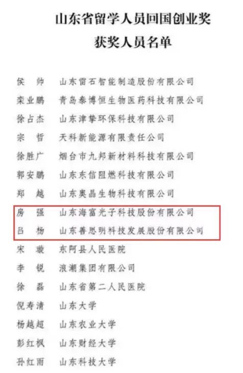 日前,山东省人民政府通报表彰20名“山东省留学人员回国创业奖”获奖人员,山东海富光子科技股份有限公司房强、山东善思明科技发展股份有限公司吕杨成功上榜,也是全市仅有的两位获此殊荣的人员。
