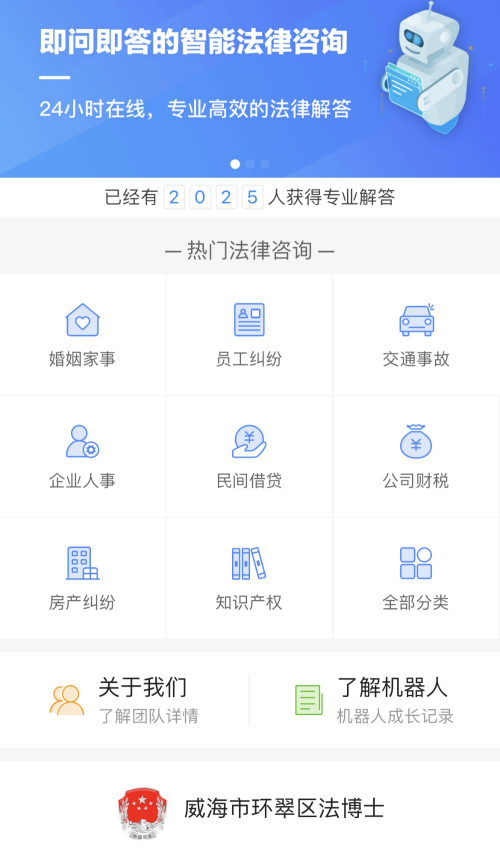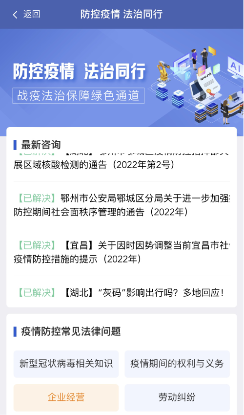 作为展现全区法治风采的窗口,“法治环翠”微信公众号坚持高标准、严要求,紧扣国家宣传重点和群众关心热点。结合新冠肺炎疫情背景下的法治需求,开通“疫情防控法律咨询”特色服务窗口,设置13类问题版块,提供22份实用法律文书,全面畅通战“疫”法治保障绿色通道。为进一步扩大法律服务覆盖面,公众号引入涵盖3万多条法律问题、1100部法律法规、30万份裁判文书的智能法律咨询服务系统——“法博士”,群众能够实时获取专业法律解答,实现“人工智能自助式法律服务”。