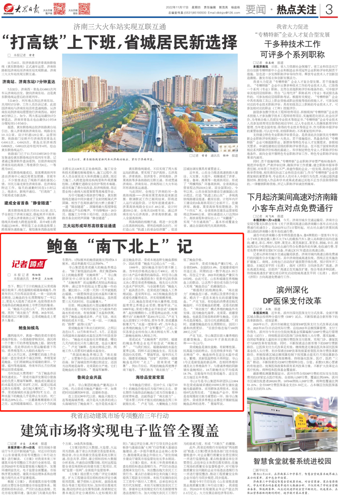 11月17日,《大众日报》发布《鲍鱼“南下北上”记》一文,聚焦荣成鲍鱼如何“南下”,走上更多人的餐桌。以下为报道全文: