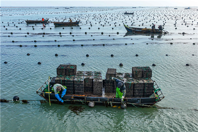 凛冽海风中,黄海一隅的荣成市爱伦湾海洋牧场,小型渔船穿梭其间,渔民将一个个数十斤的养殖笼拖拽上船,驶向宽阔锚地,在此停泊的大型运输船垂下吊钩,将养殖笼吊入大船的水舱内……