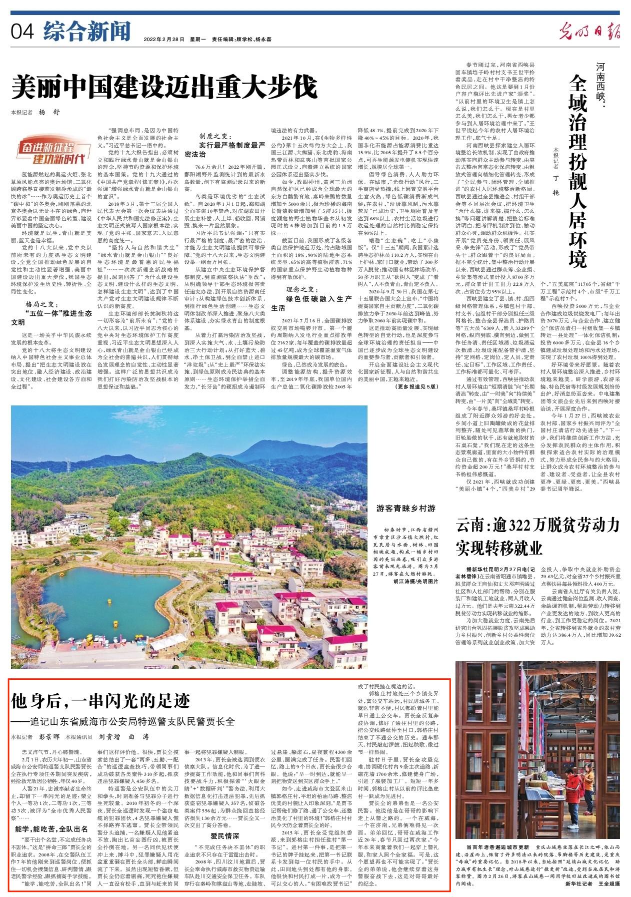 2月28日,光明日报发表文章《他身后,一串闪光的足迹——追记山东省威海市公安局特巡警支队民警贾长全》。以下为报道全文: