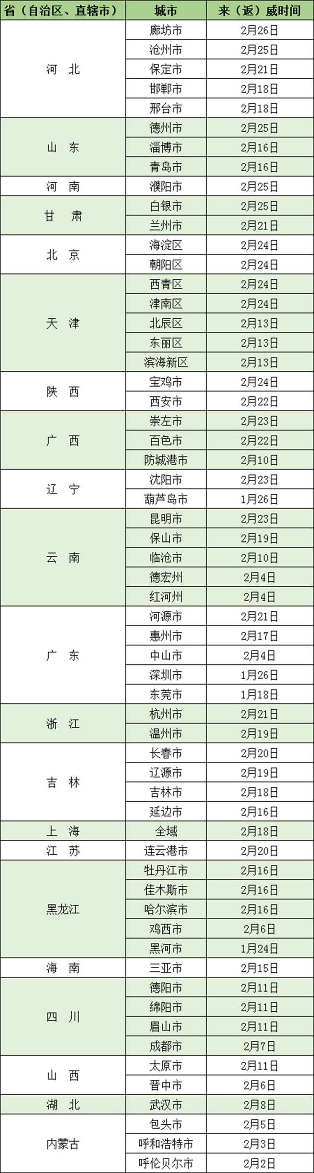 请自廊坊市、德州市、沧州市、白银市、濮阳市、北京市(海淀区、朝阳区)、天津市(西青区、津南区、北辰区、东丽区、滨海新区)、宝鸡市、淄博市、昆明市、沈阳市、崇左市、西安市、百色市、杭州市、河源市、保定市、兰州市、上海市(全域)、长春市、连云港市、保山市、温州市、辽源市、惠州市、邯郸市、邢台市、吉林市、青岛市、延边市、牡丹江市、佳木斯市、哈尔滨市、三亚市、德阳市、绵阳市、眉山市、太原市、防城港市、临沧市、武汉市、成都市、晋中市、鸡西市、包头市、德宏州、红河州、中山市、呼和浩特市、呼伦贝尔市、葫芦岛市 、黑河市、深圳市、东莞市等发生本土疫情地区的入(返)威人员,与已公布的阳性感染者活动时空轨迹重叠人员,到过或途经中高风险地区人员,请第一时间主动向所在社区(村)、住宿宾馆和单位报备,配合落实属地疫情防控指挥部管控措施和相应核酸检测要求。