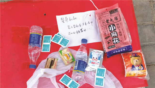 张文献打开袋子,里面果然装着几张酒精湿巾,外加两瓶矿泉水和一些小零食。居民这样无声的举动告诉张文献:“虽然不认识你,但我知道你在护我平安,辛苦了。”