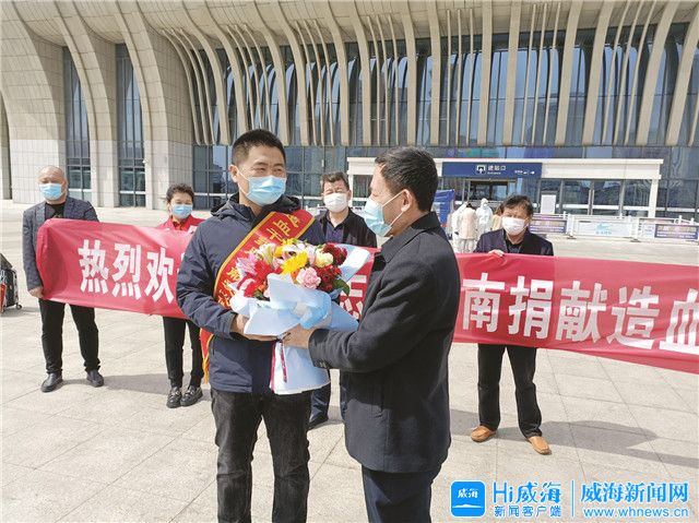 在威海站,市红十字会工作人员为王磊披上大红绶带,并献上鲜花,市红十字造血干细胞捐献奖励基金捐赠人派代表来到现场,为王磊送上3000元奖励金。