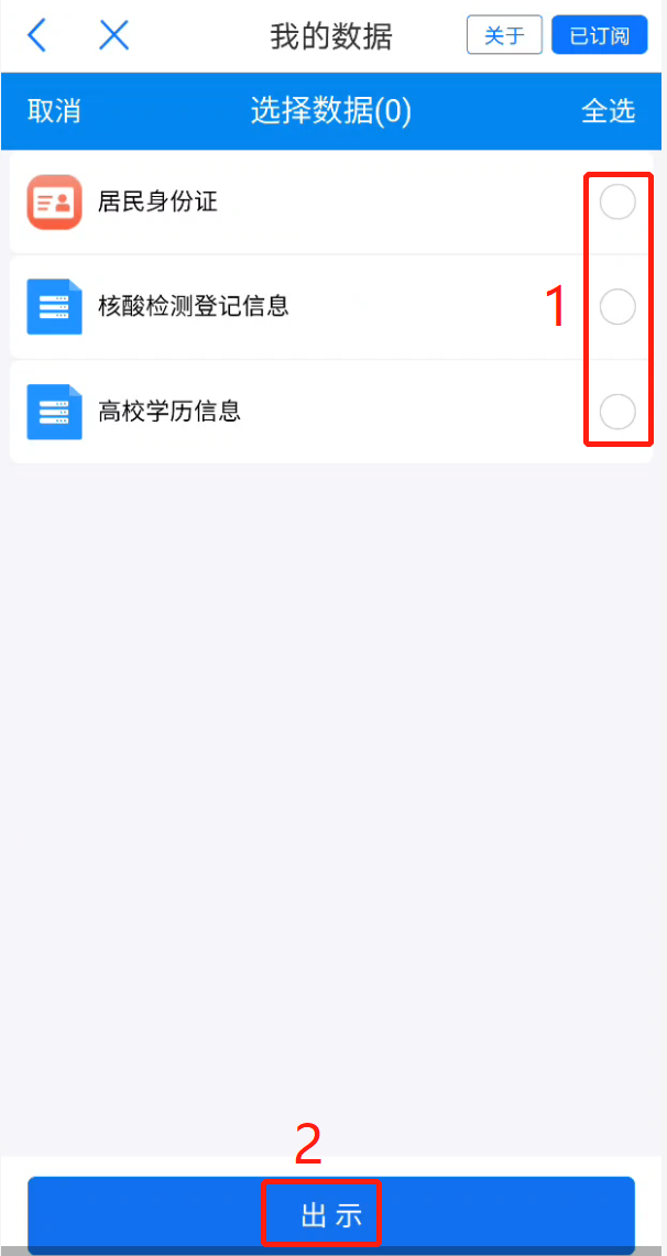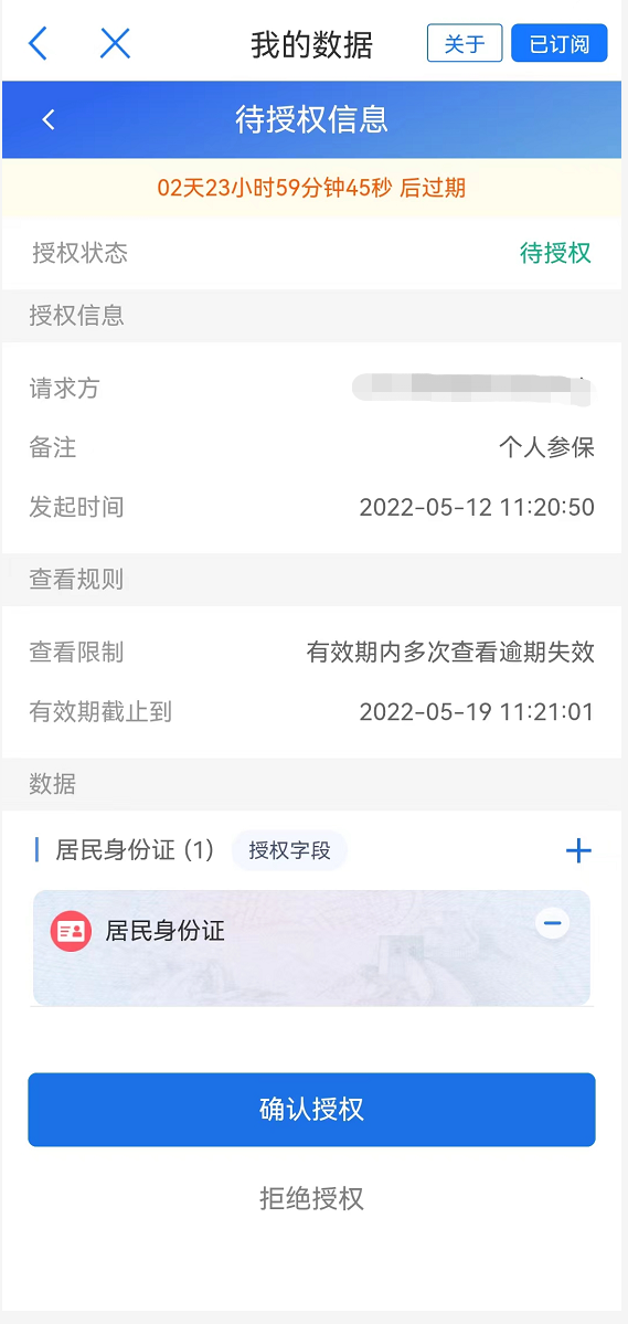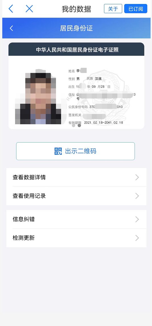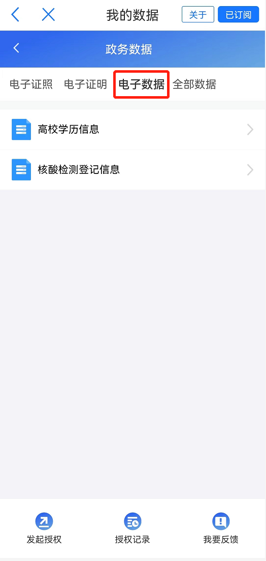 “我的数据”栏目支持个人与政府(社会)单位、个人与个人根据办事需要传递使用数据。