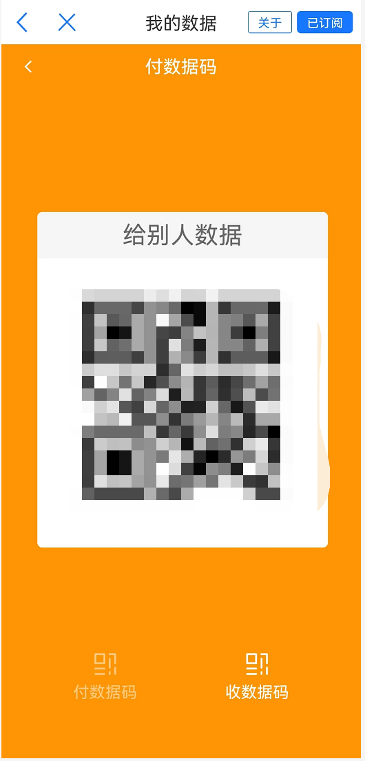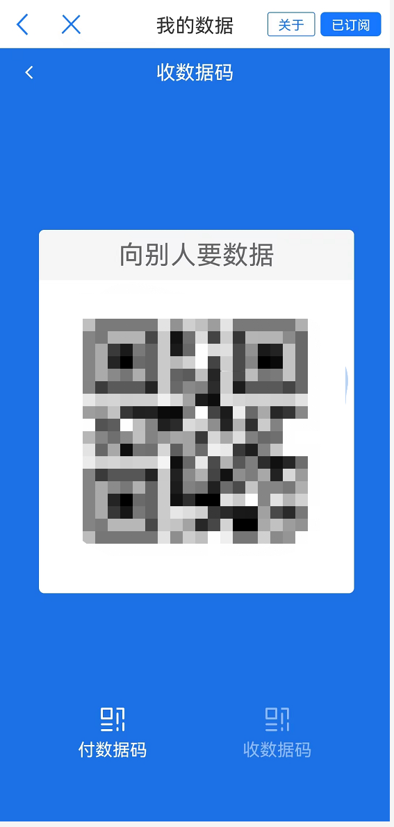 个人与个人之间传递数据同样可以采用扫码方式。数据接收方出示二维码(蓝色页面),数据提供方扫描该二维码后,进一步选择需要提供的数据并进行传递。