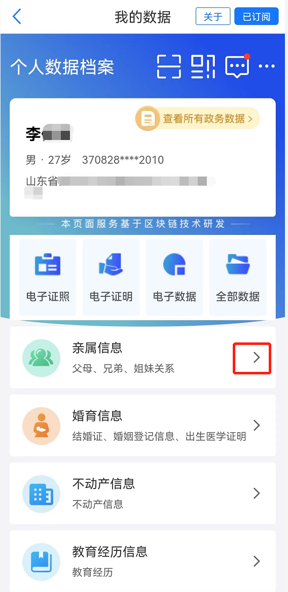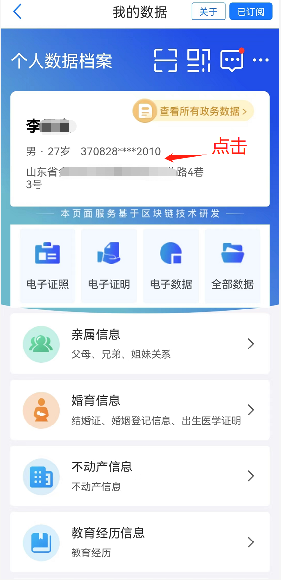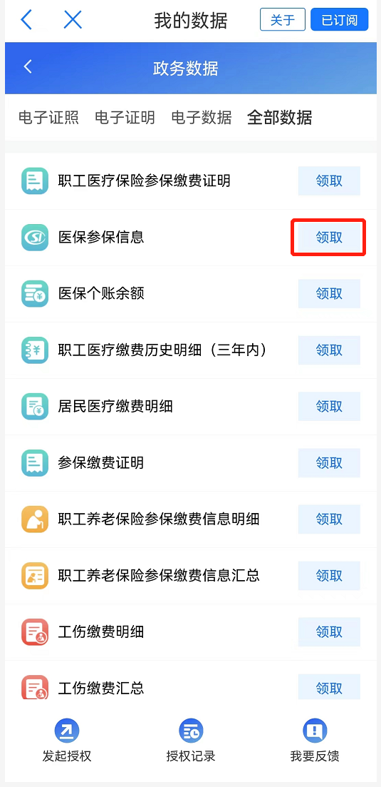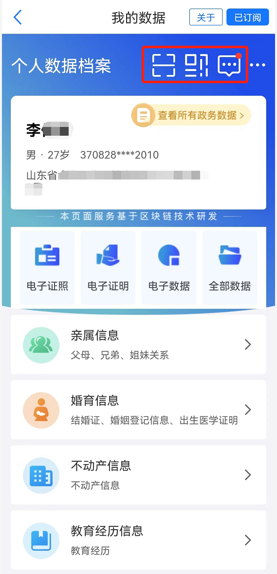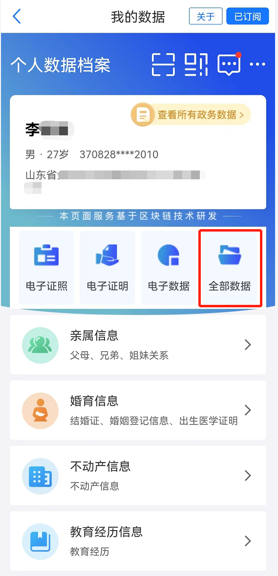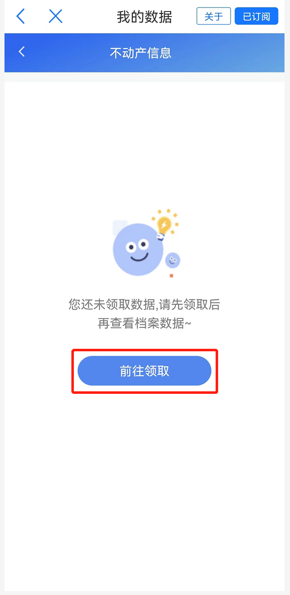 三、领取数据在婚育信息、不动产信息等分组中,如提示存在未领取数据,可按照提示信息进行领取;也可在首页点击“全部数据”进入相应页面领取数据。