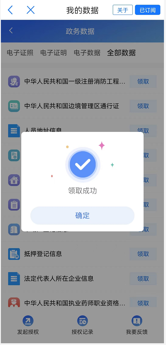 领取成功后,可以在对应的分组中查看数据,或在首页电子证照、电子证明、电子数据条目下进行查看。