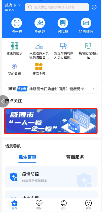 入口1:点击首页“威海市一人一档一企一档”横幅图片