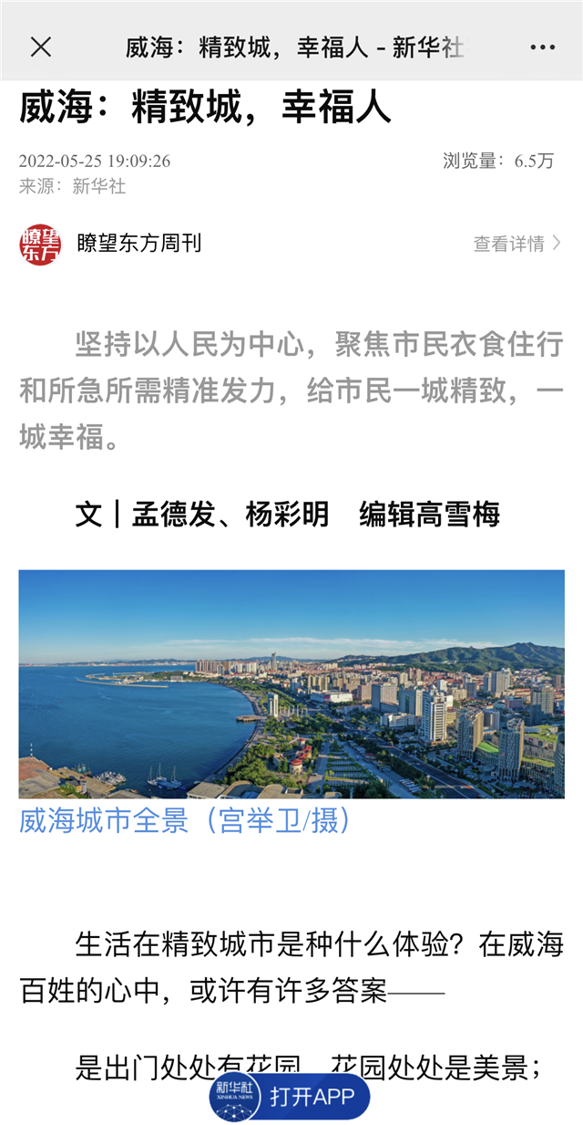 5月25日,新华社、瞭望东方周刊以《威海:精致城,幸福人》为题,报道威海聚焦市民衣食住行和所急所需精准发力,打造幸福城市的路径和成效。以下为报道全文——