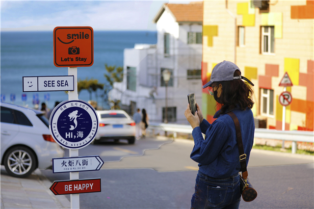 被称为“威海小镰仓”的火炬八街,南接文化西路,北通国际海水浴场,尽头与环海路形成丁字路口,全长760米。从南向北行走至坡顶转弯处,放眼望去,海天一色的图景瞬间开阔起来,随坡下行,一望无际的大海便在眼前徐徐铺开。如今的火炬八街,已成为人们争相前往的“网红打卡地”。