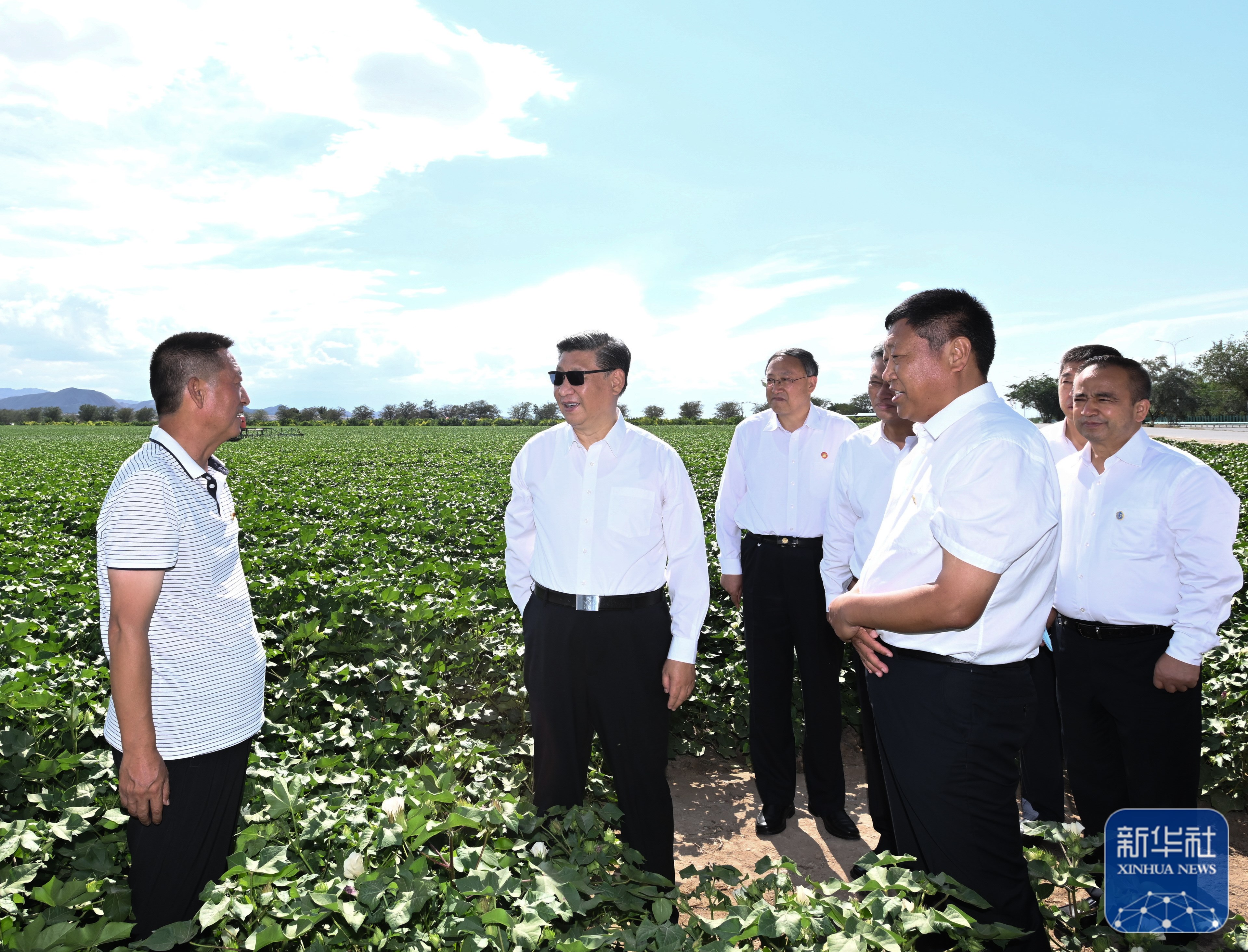 7月12日至15日,中共中央总书记、国家主席、中央军委主席习近平在新疆考察。这是13日下午,习近平在新疆生产建设兵团八师一四三团农一连棉花种植基地考察。新华社记者 申宏 摄