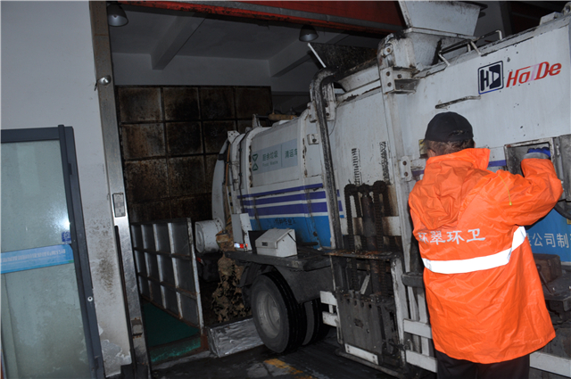 不同于普通垃圾收运车,这辆收运车内设有密闭空间,可以把挤压后的湿垃圾和污水“锁”在车内。更为关键的是,车辆还配备车辆定位、车载视频系统,用科技手段为垃圾分类监管“上锁”,实时监管车辆的作业情况,杜绝垃圾“混装混运”及“前端分类,中端混运”现象。